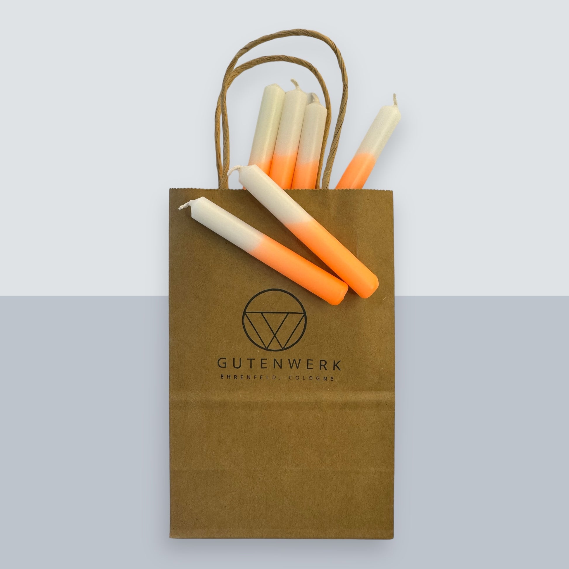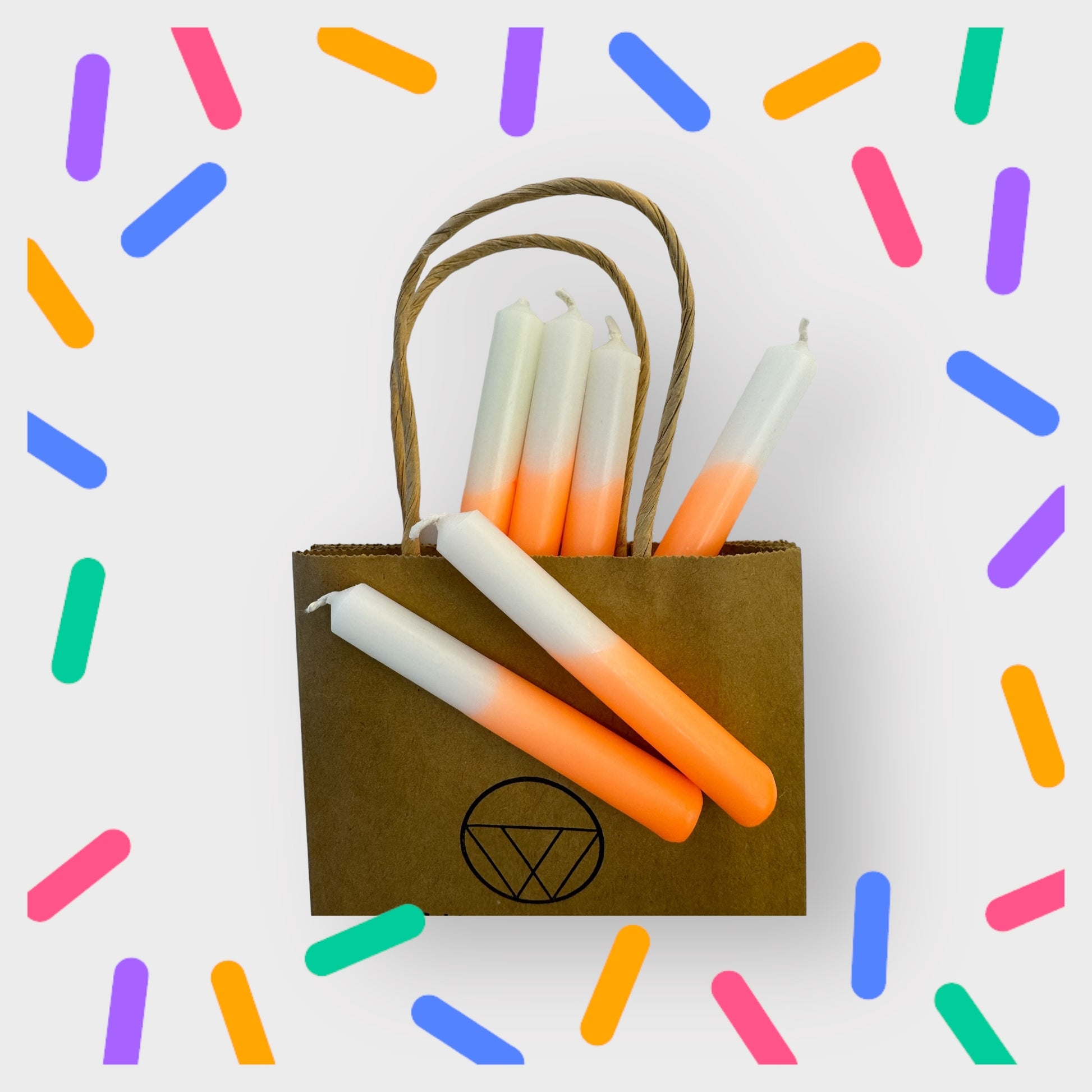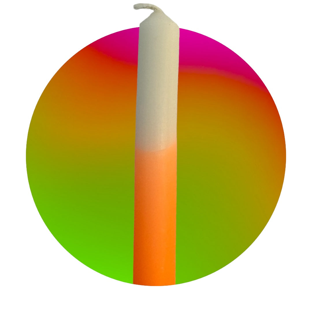 Small taper candle colored in vibrant neon colors. Ideal use for birthday wreaths or small candle holders.