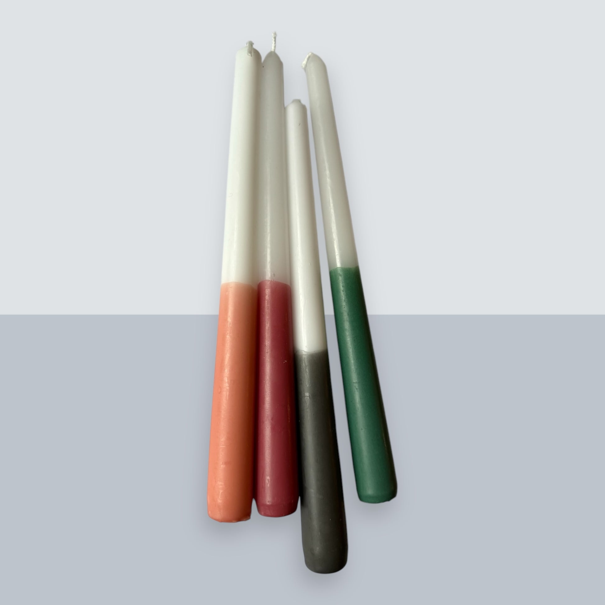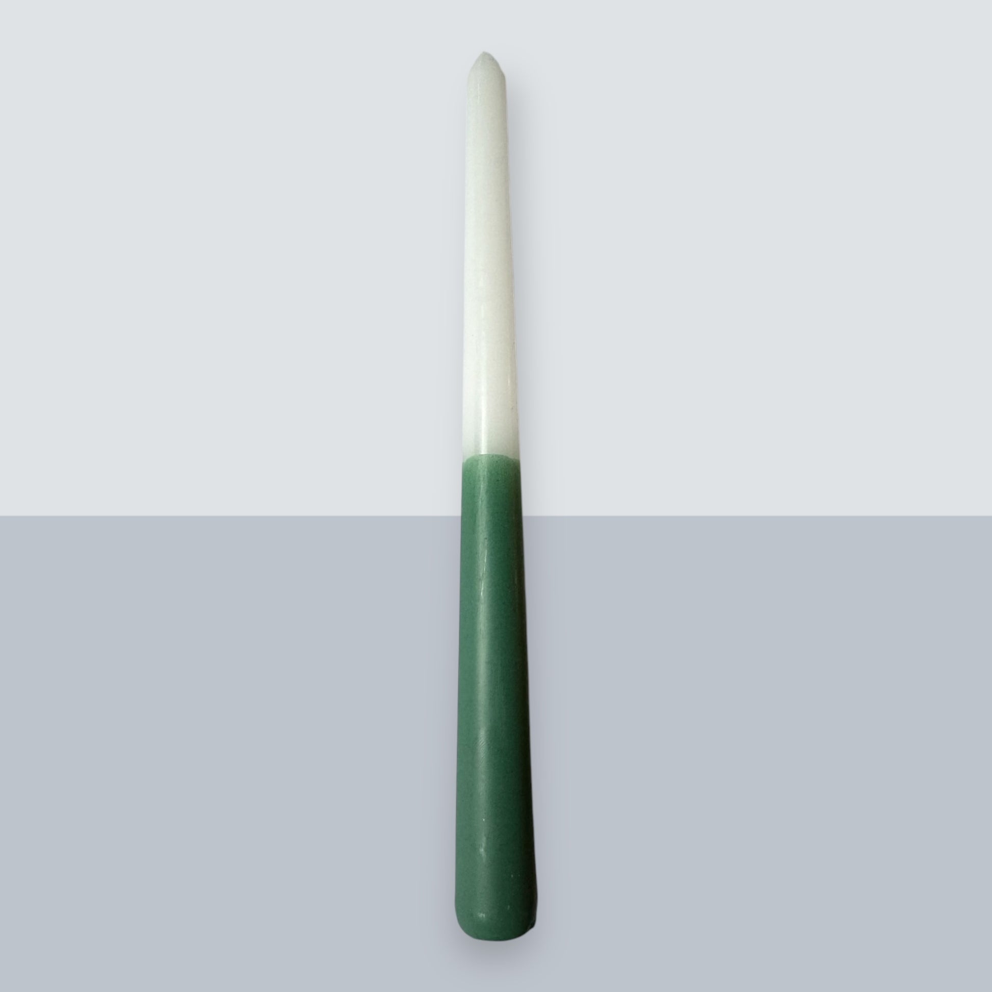 Weiße Stabkerze gedippt in ein weihnachtliches tannengrün.